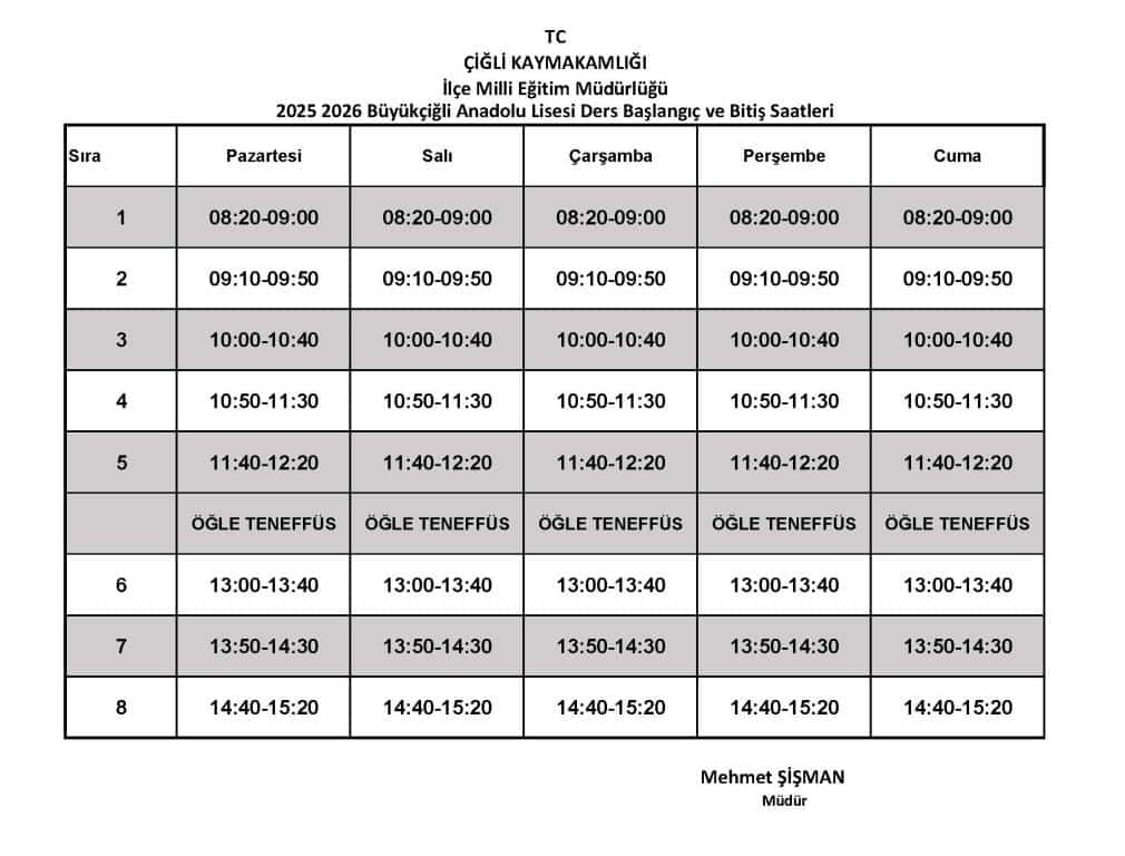 2025-2026 Eğitim-Öğretim Yılı Büyükçiğli Anadolu Lisesi Ders Başlangıç-Bitiş Çizelgesi